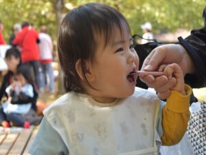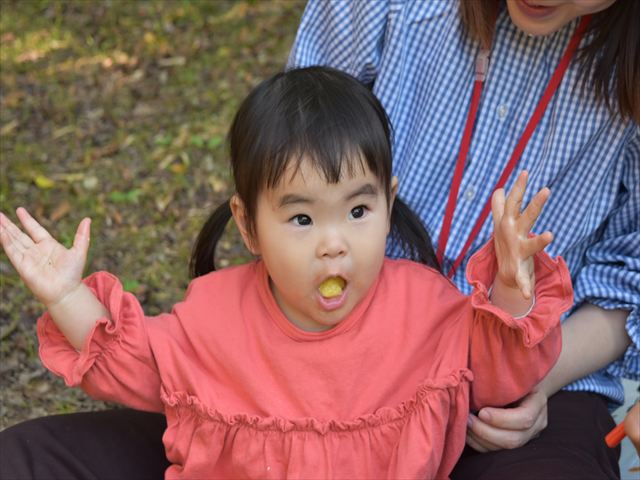 手掴みで食べたりスプーンを使って食べたりなど様々ですが、自分で頑張って食べ進めようと頑張っています![]()