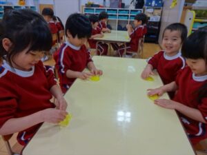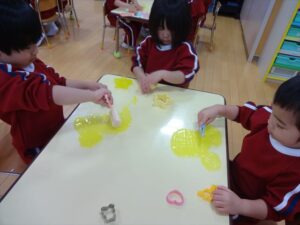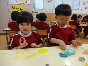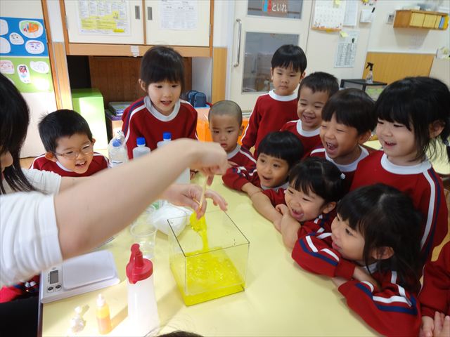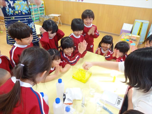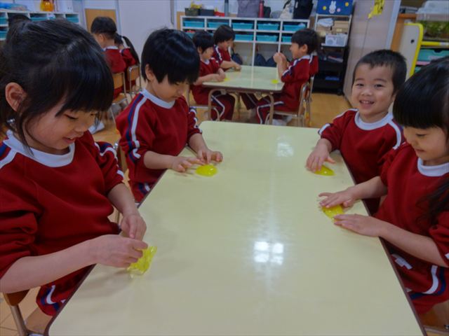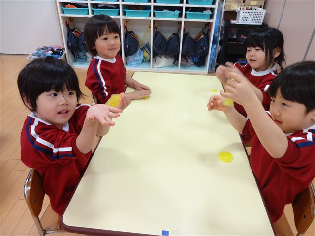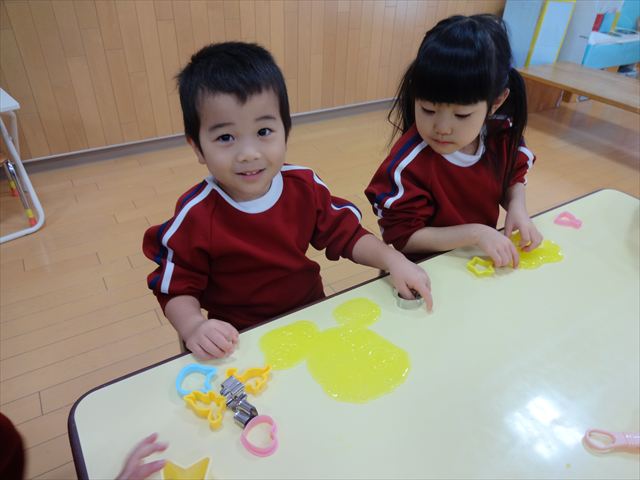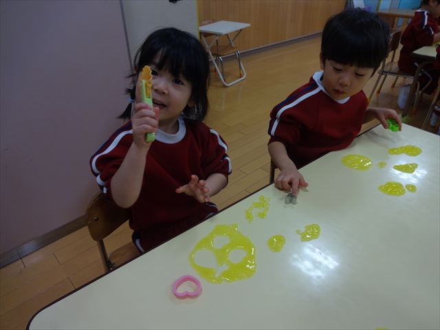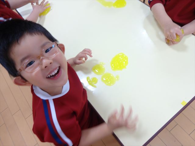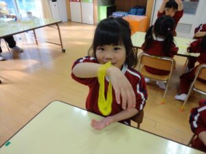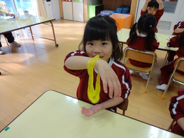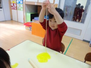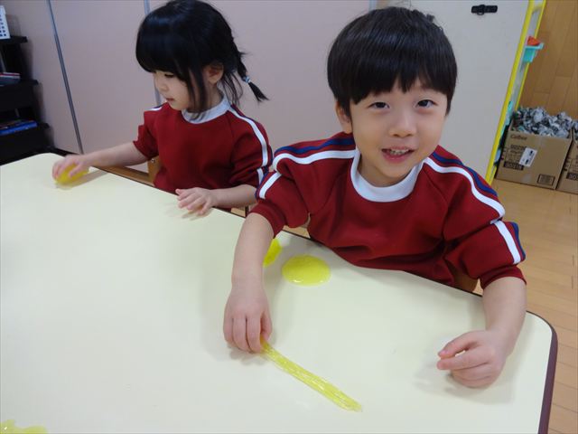 スライム遊びで大興奮🌟(星組) スライム遊びで大興奮🌟(星組) 今日は楽しみにしていたスライム遊び 教頭先生が作ってくれました 一つ一つ丁寧に作り方を見せてくれました みんな真剣な表情で見ています 色を入れて混ぜると…… 黄色に🟨「おぉ~~~」と拍手が👏 大興奮 実際に触ってみると、「冷たくて気持ち~」「ぷにぷにしてる」「綺麗な色!」と色々な感想がでてきました 型や道具を使っても遊びました 色々な形ができたよ 伸ばしたり丸めたりしながら、 ヘビやブレスレットを作って見せてくれました 他にも~ ハート ミッキーやお顔 職人さんのように黙々と!集中する子も 自分の思っている形に作ったり、想像しながら見立てたりと ニコニコ笑い楽しそうに、時には真剣な表情が見られました 沢山遊べて満足そうな星組さんでした 2026年1月29日 : 3歳児クラス