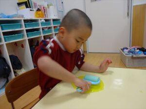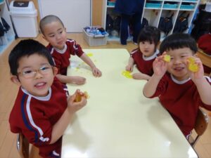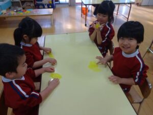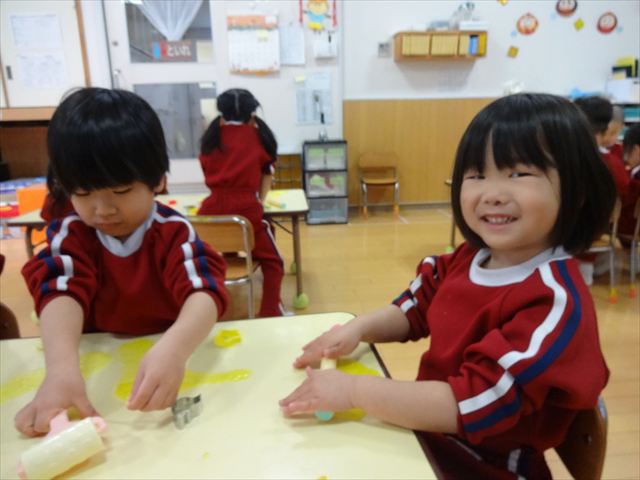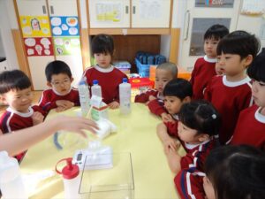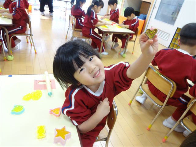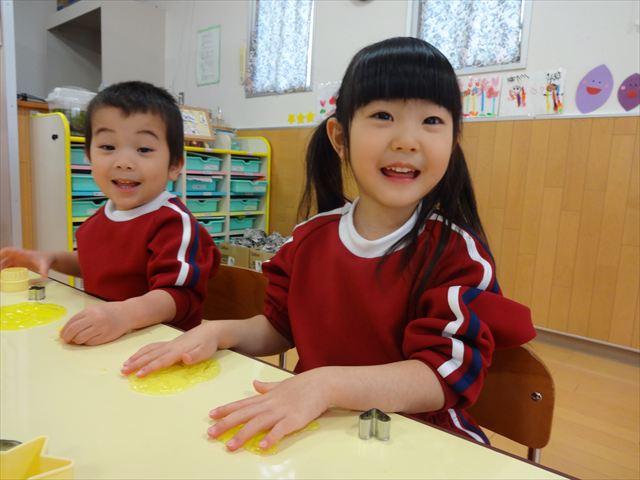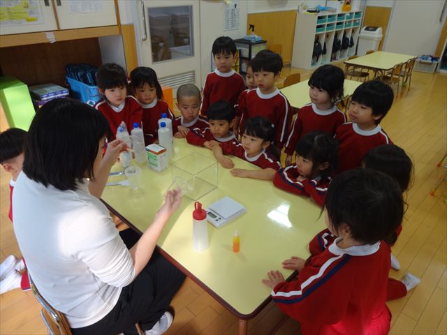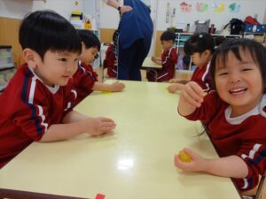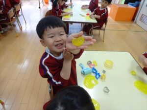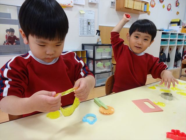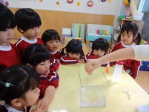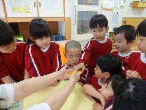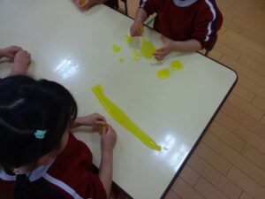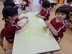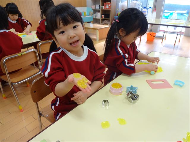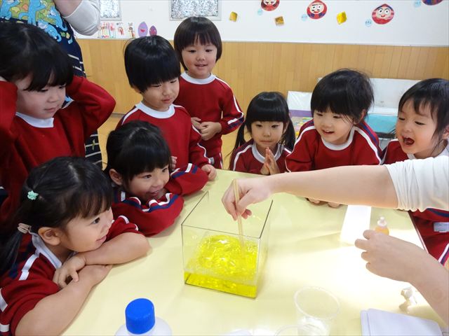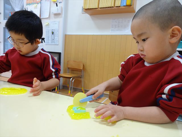 スライム遊びで大興奮🌟(星組) スライム遊びで大興奮🌟(星組) 今日は楽しみにしていたスライム遊び 教頭先生が作ってくれました 一つ一つ丁寧に作り方を見せてくれました みんな真剣な表情で見ています 色を入れて混ぜると…… 黄色に🟨「おぉ~~~」と拍手が👏 大興奮 実際に触ってみると、「冷たくて気持ち~」「ぷにぷにしてる」「綺麗な色!」と色々な感想がでてきました 型や道具を使っても遊びました 色々な形ができたよ 伸ばしたり丸めたりしながら、 ヘビやブレスレットを作って見せてくれました 他にも~ ハート ミッキーやお顔 職人さんのように黙々と!集中する子も 自分の思っている形に作ったり、想像しながら見立てたりと ニコニコ笑い楽しそうに、時には真剣な表情が見られました 沢山遊べて満足そうな星組さんでした 2026年1月29日 : 3歳児クラス