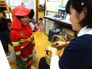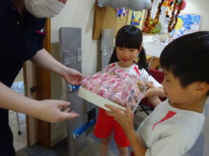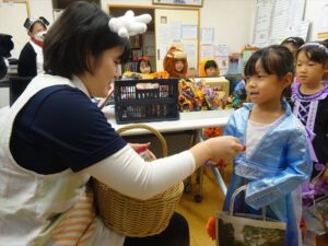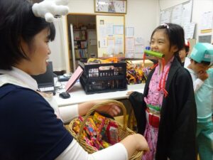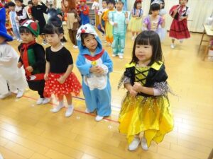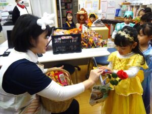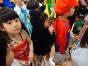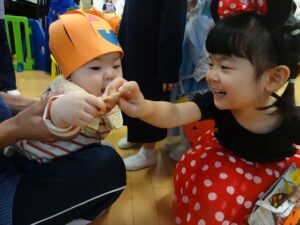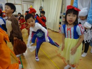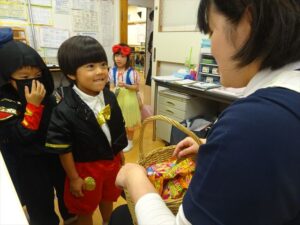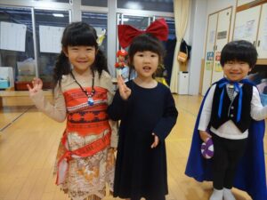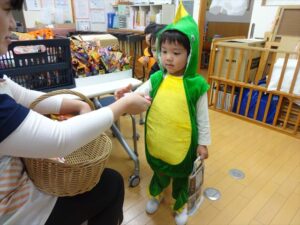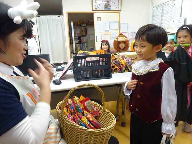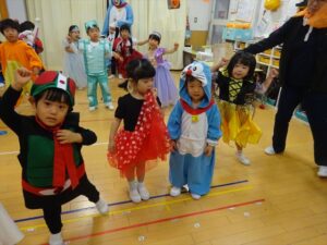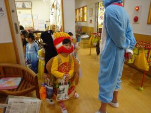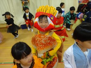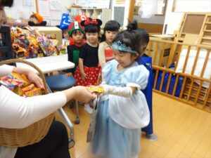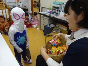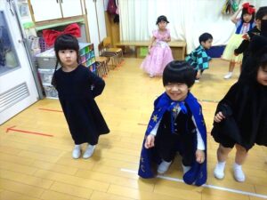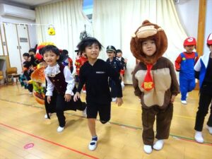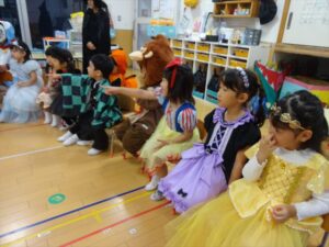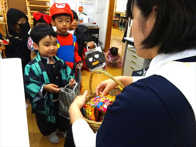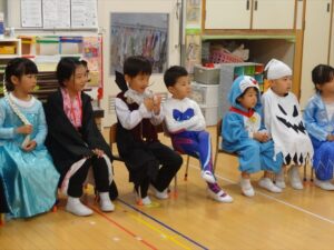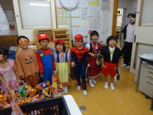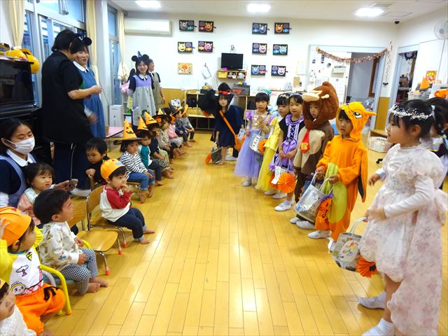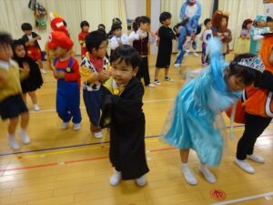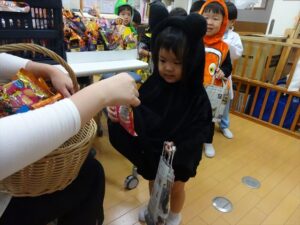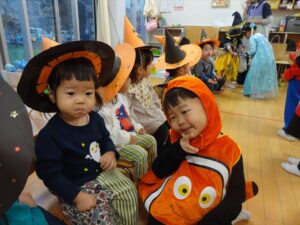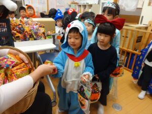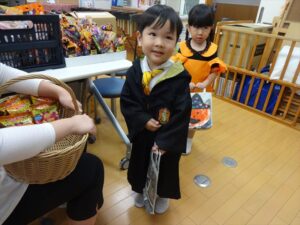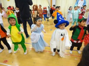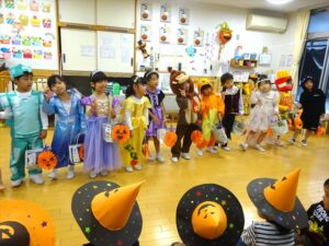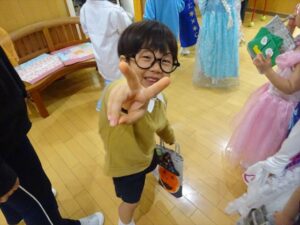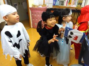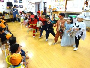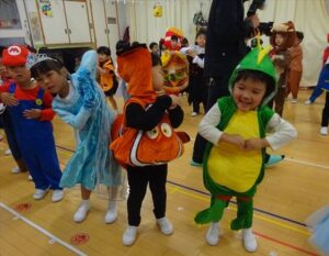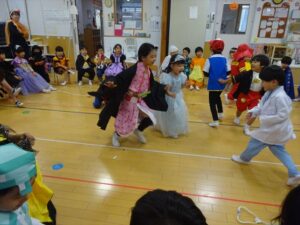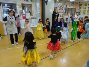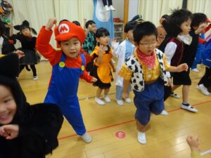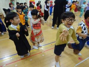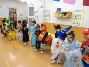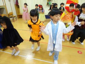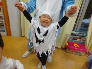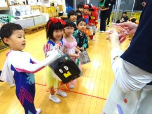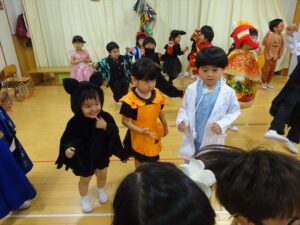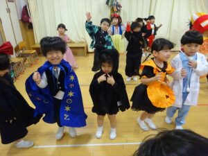 ハロウィンパーティー(星・月・宙組)👻 ハロウィンパーティー(星・月・宙組)👻 今日は、ハロウィンパーティー みんなとっても素敵なコスチュームで登園してくれました👻 《星組》 《月組》 《宙組》 「トリックオアトリート!お菓子をくれないといたずらしちゃうぞ♡」と可愛く言って 鳥組・花組・虹組さんからお菓子をもらいました 職員室にもお邪魔して…💜合言葉を言ってお菓子をもらいました 「ありがとう」とお礼も忘れずに 沢山もらえて嬉しそうでした 次は、みんなでジャンボリミッキーを踊りました 音楽に合わせて楽しく踊りました そしてお次は~フルーツバスケットもしました 「ポケモンの人!」「プリンセスの人!」などと大盛り上がり 笑顔溢れる1日でした グループホームのおじいちゃんおばあちゃん達からお菓子のプレゼントを頂きました ありがとうございます 午後のおやつは、おばけのモンブラン👻この前、月・宙組さんが畑でとってきてくれたお芋も材料に入っています クリームも乗っておいしかったよ! 2025年10月31日 : 3歳児クラス年中・年長クラス年中クラス年長クラス