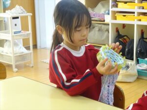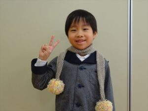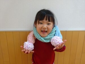 できあがって首に巻いてみると、「あったかーい!」「○○ちゃんのふわふわ!」とお互いに見せ合って嬉しそうな子どもたちでした