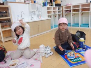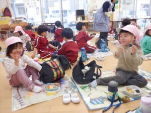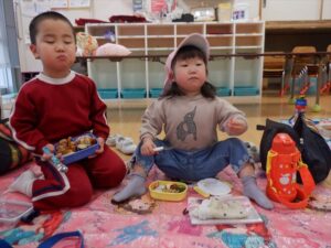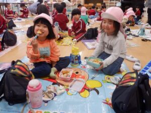 広いお部屋でレジャーシートを敷いて、みんなで一緒に食べたお弁当