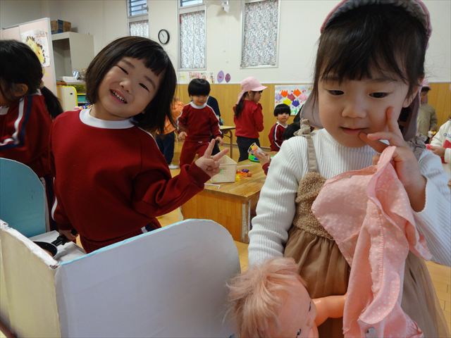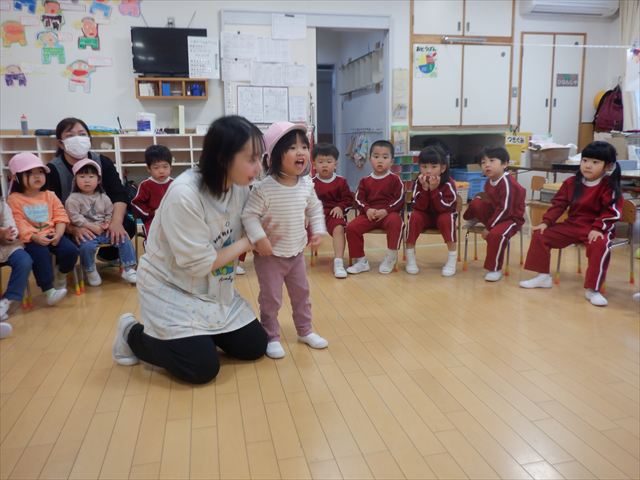 虹組さんは、憧れのお兄さん、お姉さんの遊びを見て、「やりたい」笑顔が溢れていました