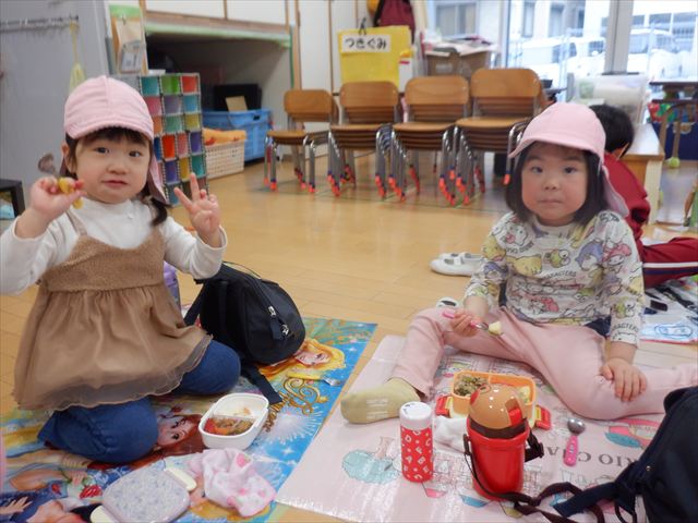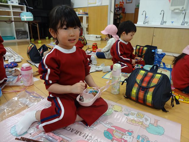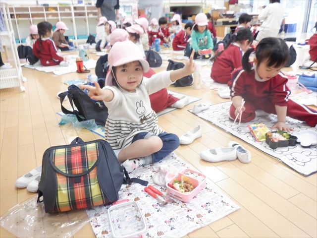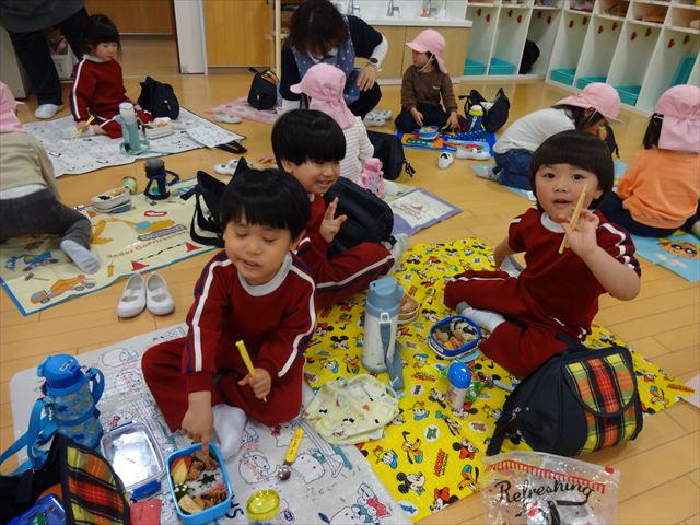 広いお部屋でレジャーシートを敷いて、みんなで一緒に食べたお弁当