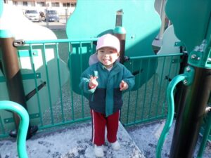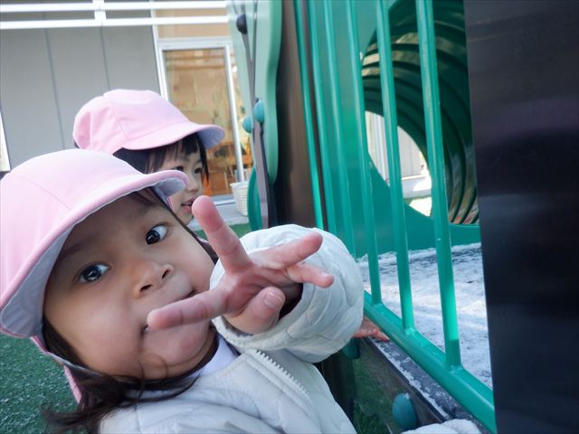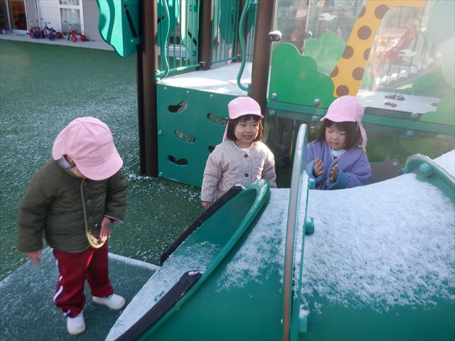 2月9日の朝は、前日に降った雪が園庭の固定遊具に積もって残っていました![]()