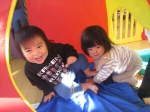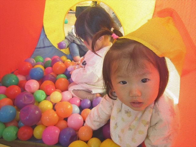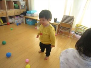 お友達とお家の中でキャ~と楽しそうにボールを出したり入れたり