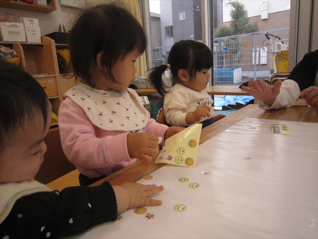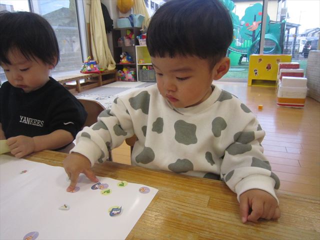 指先で上手にシールを剥がしてペタッみんな、とっても集中して貼っていました