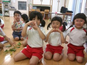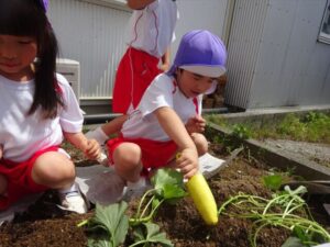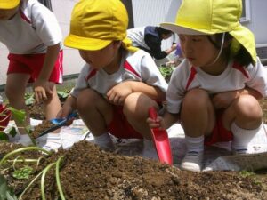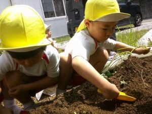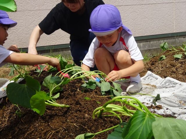 芋の苗を植えました🍠(月・宙組) 芋の苗を植えました🍠(月・宙組) 月・宙組さんで芋の苗を植えに行きました🍠 まず初めに保育者から苗の植え方について説明を聞きます👂 月・宙組さんで一緒に手を繋いで、しゅっぱ~つ!! 苗の植え方はどうだったかな~? 葉っぱの部分には土をかけないように慎重に… 『うわ~!ミミズがおる~!』と時には虫を見つけて大はしゃぎ 水分補給の時間もこまめに取りながら、楽しく植えることができました 立派に育ちますように… 2025年5月23日 : 年中・年長クラス年中クラス年長クラス